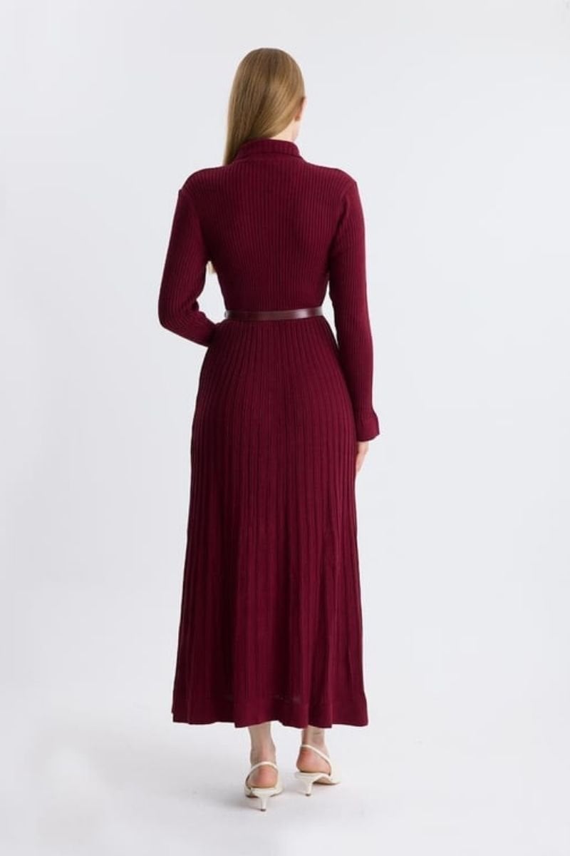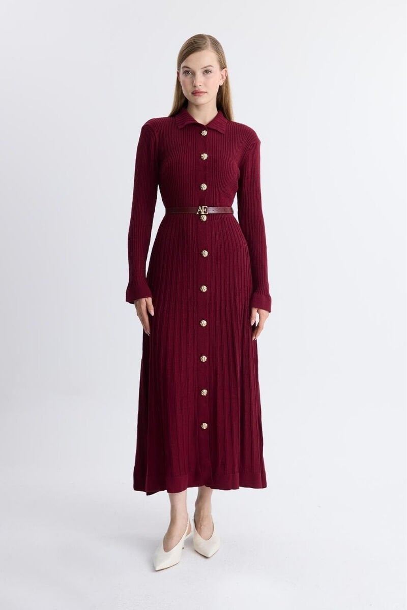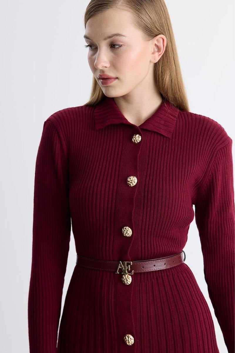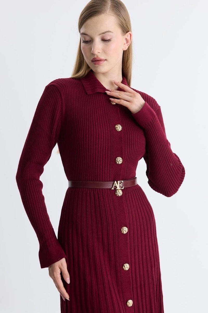 Gold Düğmeli Triko Kemerli Elbise - Bordo