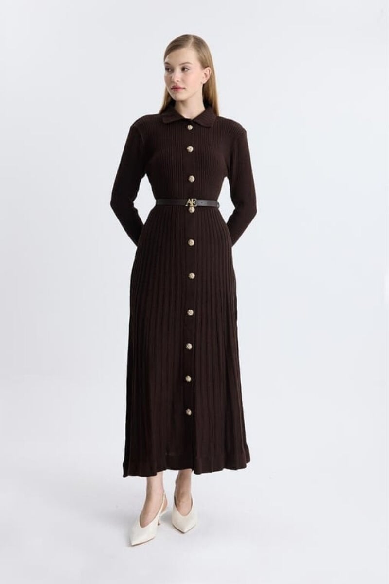 Gold Düğmeli Triko Kemerli Elbise - Kahve