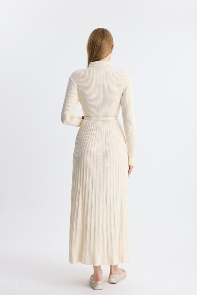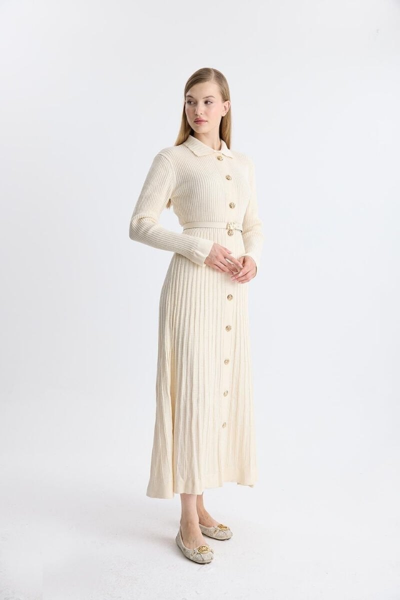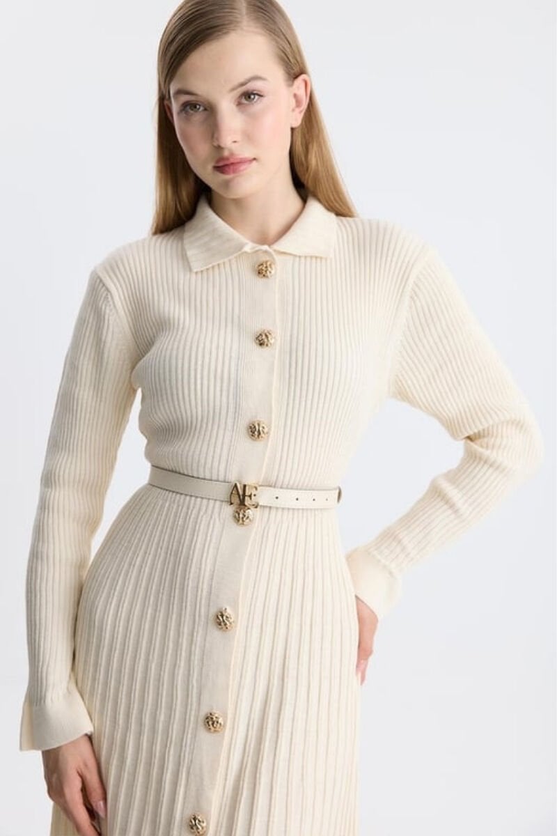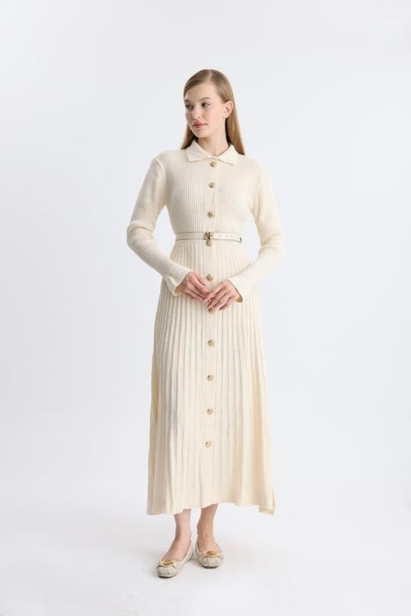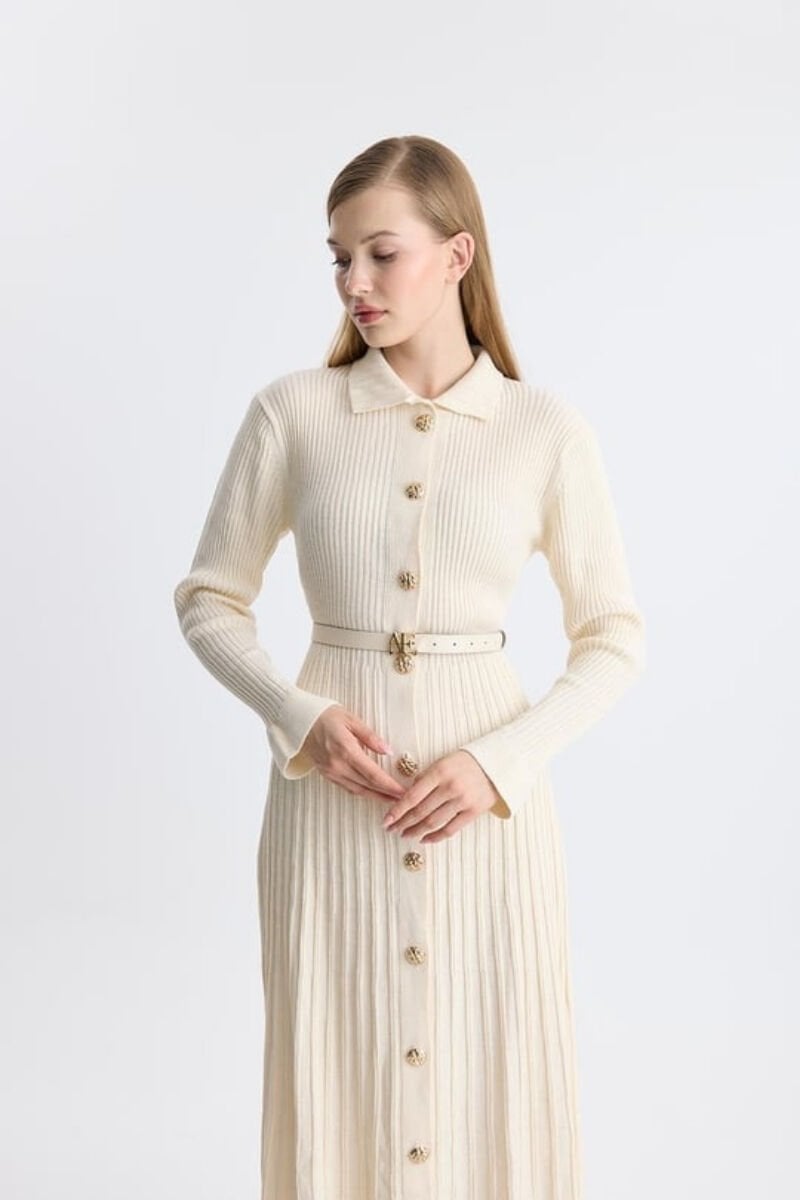 Gold Düğmeli Triko Kemerli Elbise - Krem